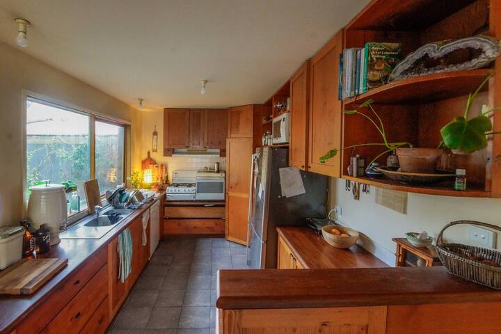 The house is in a quiet leafy street, 6 minutes walk from the train station. It is a passive solar design with lots of windows and feels light and spacious. It has a back yard and vegie garden.
